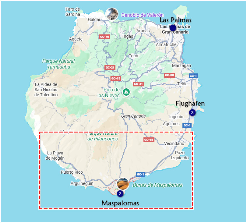 Anreise: Vom Flughafen Gran Canaria (LPA) nur 30–40 Min. mit dem Auto oder Bus (Linie 66/30).